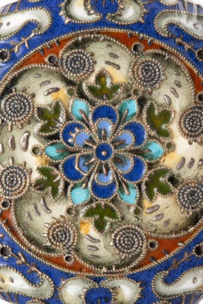 Полихромная эмаль на темно синем фоне, украшена геометрическими узорами и цветами.