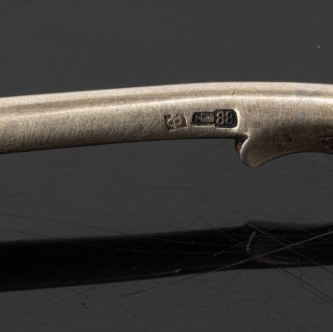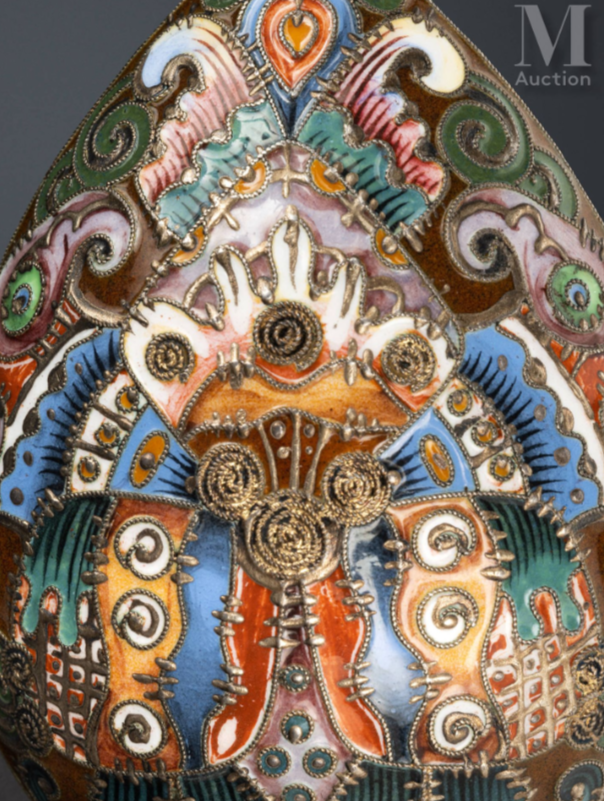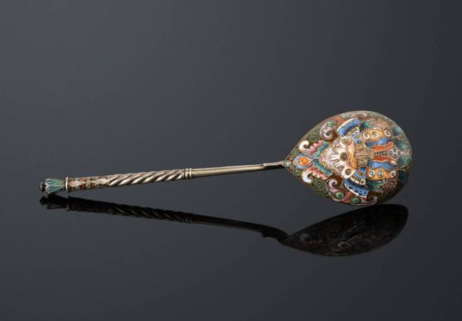 en vermeil 88 zolotniks (916 millièmes), à décor émaillé polychrome cloisonné de volutes, spirales filigranés et motifs géométriques dans les tons bleus, oranges, verts et violets, le manche en partie torsadé et l’extrémité émaillée en suite.