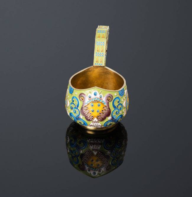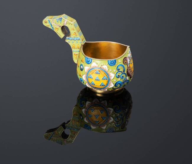 Kovch en vermeil 88 zolotniks (916 millièmes) à décor émaillé polychrome cloisonné sur fond vert de motifs géométriques, rinceaux et triangles stylisés dans le style Néo-russe.