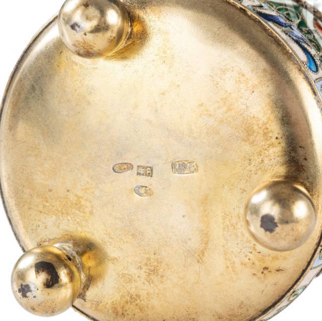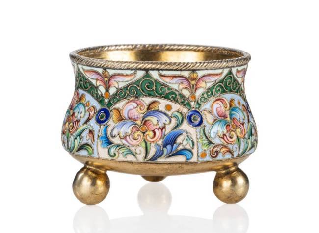 Salière en vermeil 88 zolotniks (916 millièmes) au beau décor émaillé polychrome cloisonné de fleurs et rinceaux dans les tons pastel sur fonds alternés bleu ciel et crème, le col à décor torsadé et reposant sur trois pieds boule.