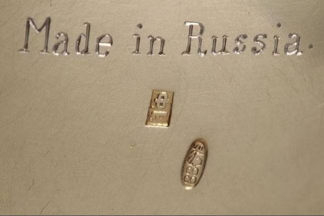 Resting on a flared foot ring, of standard form with raised prow and large hook handle. The body in shaded enameled florals on a moss green ground, and the prow with the Imperial double headed eagle. The interior brightly gilded. Hallmarked Moscow, Cyrillic maker’s mark FR, and 88 silver standard. Length 5.75 inches (14.5 cm).