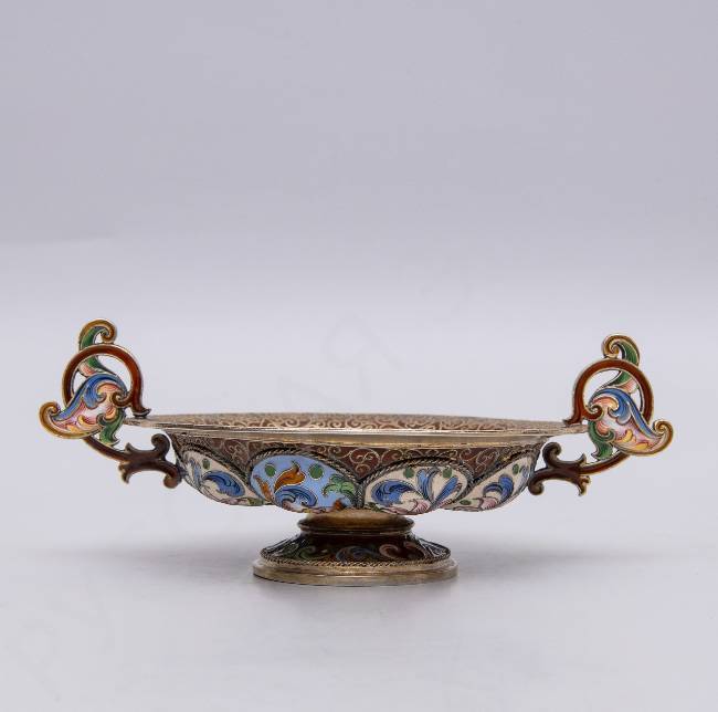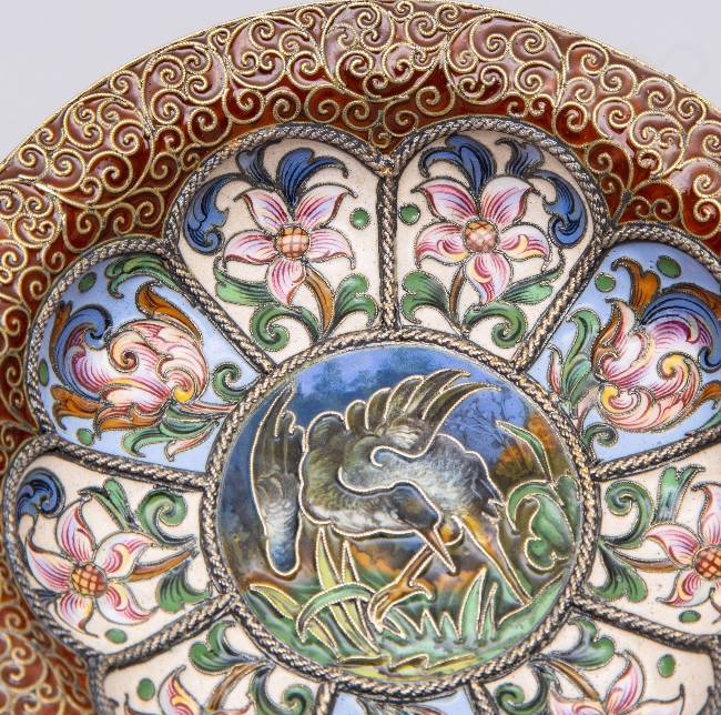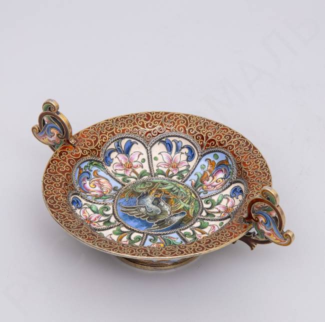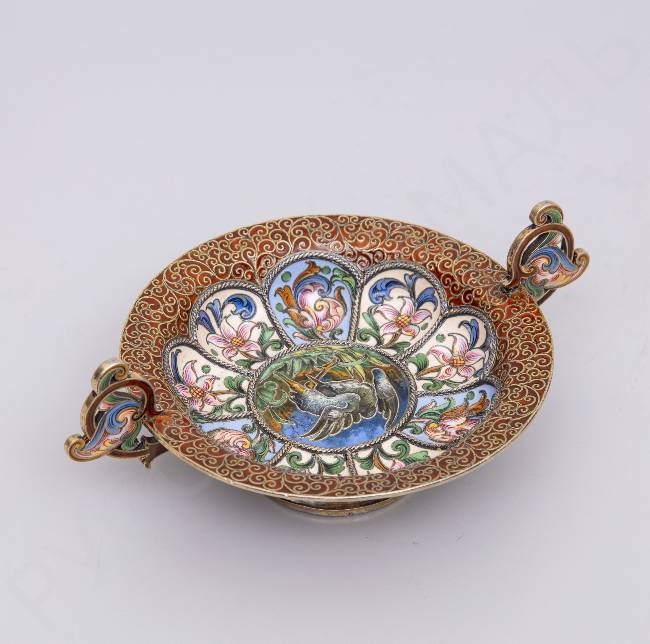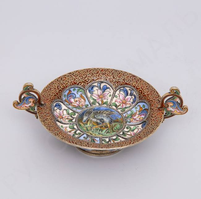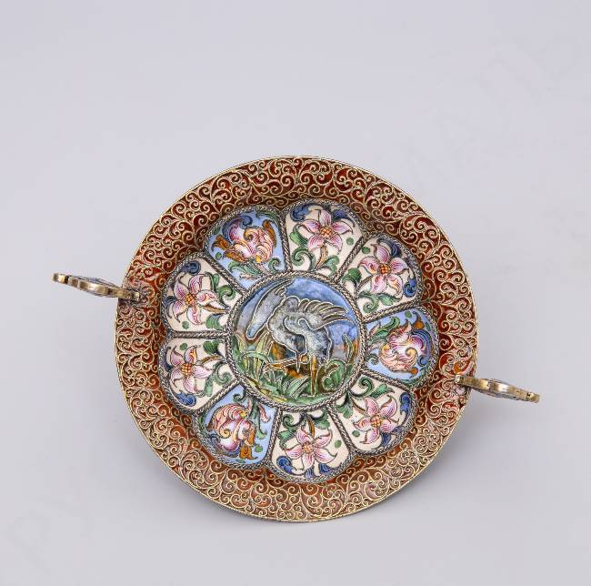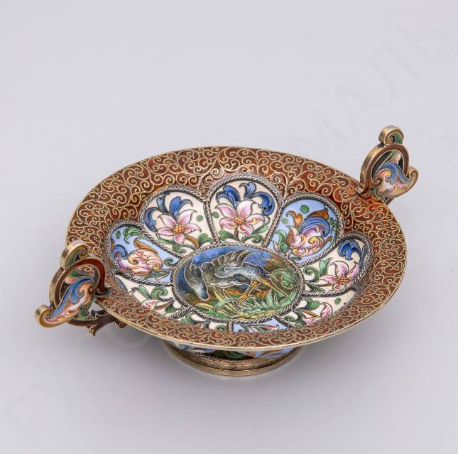 Чарка с двумя ручками в стиле модерн с расписной эмалью по скани «Серая цапля». Рюкерт