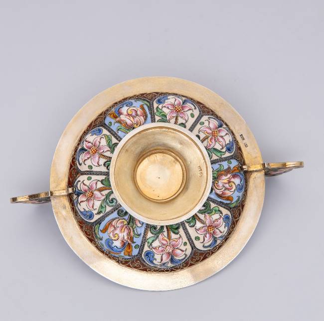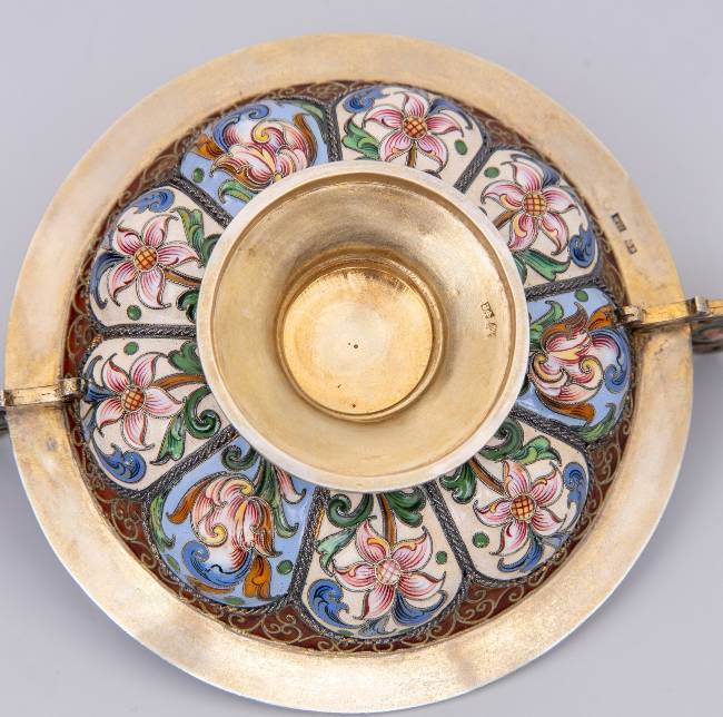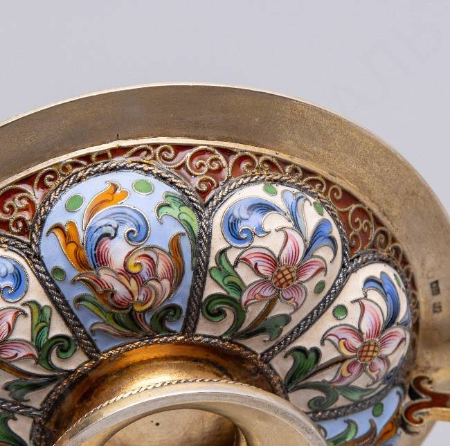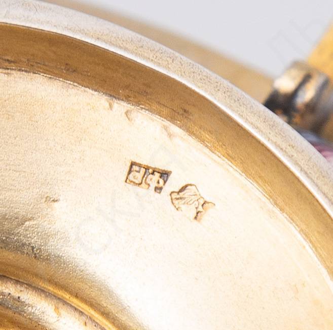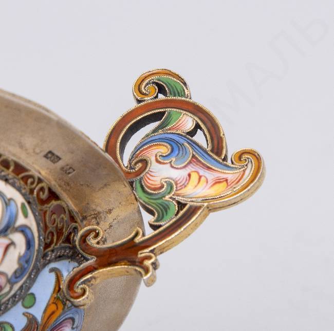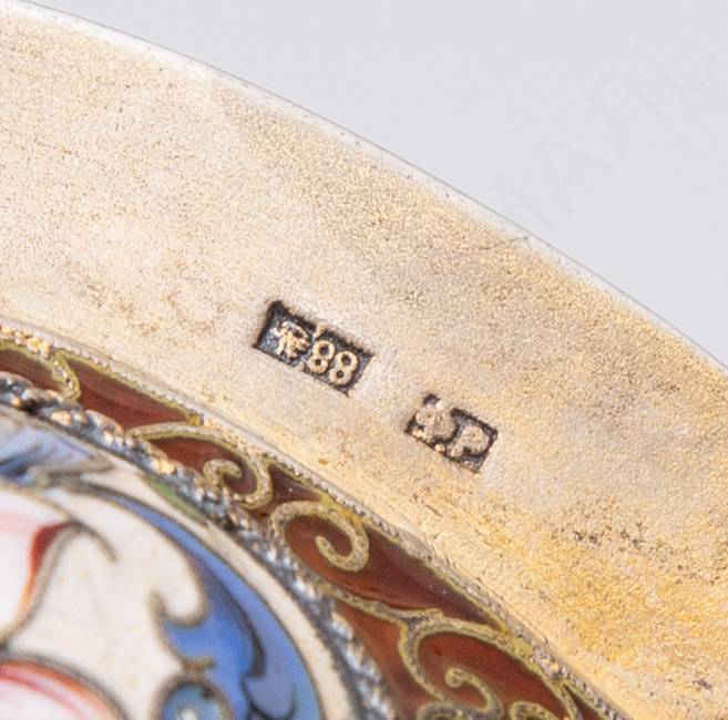 Клейма: 88 пробы с гербом города Москвы «Георгий Победоносец», мастера – «Ф.Р.» (по борту), «женская голова в кокошнике, обращенная влево», мастера – «Ф.Р.» (на дне).