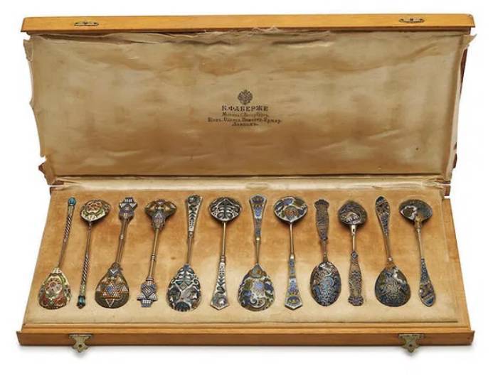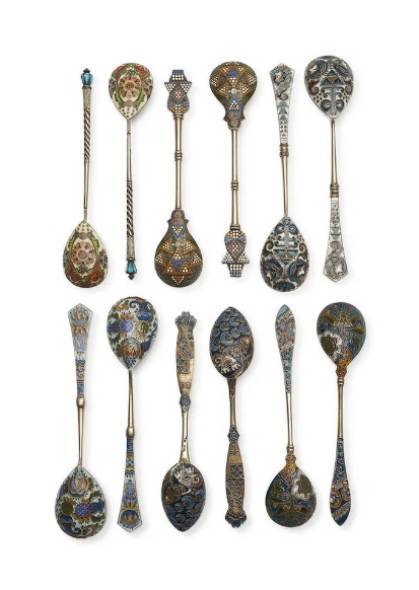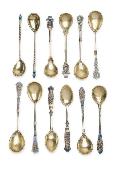 Faberge | Set of 12 silver and enamel spoons, attributed to Feodor RÜCKERT, Moscow, 1896–1908