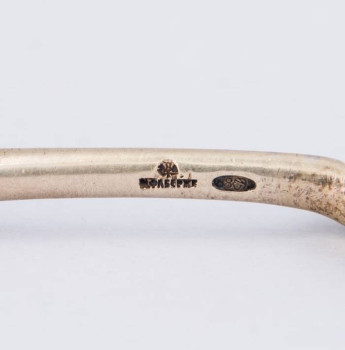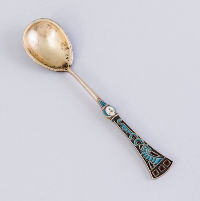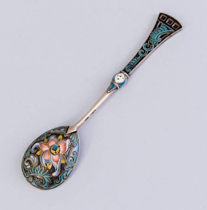 ЛОЖКА ФАБЕРЖЕ, серебро (88) с эмалью, Москва, 1899-1914. Вес 34,6 г. Длина 13,5 см.