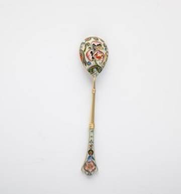 Fabergé-Cloisonné-Email-Silberlöffel Russland, Moskau, Feodor Rückert für Fabergé, 1908-1917 Silber, vergoldet. Laffe mit stilisierter Blüte gerahmt von Rankenwerk in feinem, buntem Emailabstufungen gerahmt von Silberdraht. Stielende beidseitig emailliert. Punziert mit Bezirksbeschauadministrationsmarke mit Feingehalt ''88'', Firmenmarke ''K.FABERGE'' in Kyrillisch mit Hoflieferantenzeichen, die die Werkmeistermarke ''FR'' überlagert. Laffelinnenseite kleine Kleberreste. L. 11 cm, 21 g A Fabergé silver-gilt and cloisonné enamel spoon. Russland, Moskau, Feodor Rückert, 1908-1917. Reverse of bowl enameled with stylized blossom surrounded by scrolls in shades of green, cinnamon, red, magenta, white and blue. Both sides of the end of handle dacorated with polychrome enamel. Stamped with assayer's mark with 88-stanard, ''K.FABERGE'' in Cyrillic with Imperial warrant overstiking workmaster's mark ''FR''. Tiny glue remainings (bowl inside). 11 cm long, 21 gr.