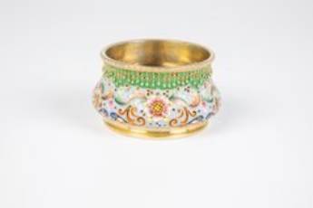 Silber, vergoldet. Runder Fuß. Der untere Teil der gedrückten Wandung ist mit farbenfrohen Blüten und Blattranken auf blauem Emailgrund dekoriert. Der obere Teil ist mit vergoldeten Silberstäben auf grünem Emailgrund verziert. Punziert mit Bezirksbeschauadministrationsmarke mit Feingehalt ''84'' und Meistermarke ''FR'' in Kyrillisch, eingeritzte Nr. ''1826/2''. D. 6,5 cm, H. 3,8 cm, ca. 72 g - Feodor Rückert arbeitete selbstständig in seiner eigenen Werkstatt, jedoch wurde der größte Teil seiner Produktion durch Fabergé vertrieben.