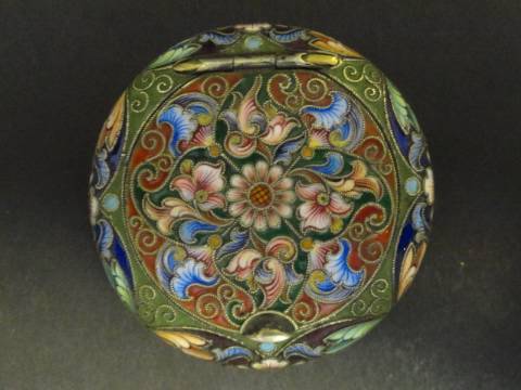 A beautiful antique Russian silver 84 cloisonne shaded enamel snuff box by Feodor Ruckert. Diameter is 2.25 inches. Weight is 70 grams.