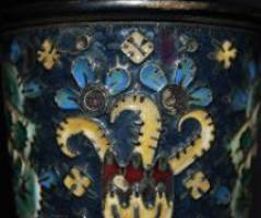 Outstanding Faberge Silver Enameled beaker -mark for Faberge in cyrillic (K.Faberge), mark for Feodor Ruckert (FR) , 84 and faded number 8 (inventory number). The enamel on the beaker is in perfect condition, no crazing,no cracks.Perfect detailing.Measures: 4 1/2" tall x 2 3/4" diam. Feodor Ruckert was famous for producing the most expensive and beautiful enamel items in Russian Style.Although he owned a small shop in Moscow,he was mainly making enameled items for Faberge.Those creations were marked with both marks-for Faberge and Feodor Ruckert. Please enlarge the pictures for a close up look. Dealers always get a discount. Communication is very important,so please if you have more questions,or wish to make an offer, do not hesitate to contact me.