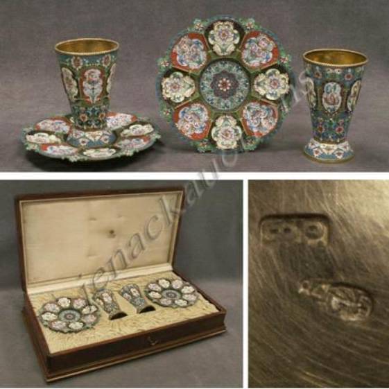 RUSSIAN SILVER/ENAMEL DECORATED CUP/PLATE SET, BEARING THE MARKS FOR FEODOR RUCKERT, CASED. RETAILED BY FABERGE. CUPS/HEIGHT 4 3/4"; PLATES/DIAMETER 6 1/2"; CASE 11 1/2 X 20" WITH COPY OF CORRESPONDENCE FROM RUSSIAN DEPARTMENT, CHRISTIE'S LONDON