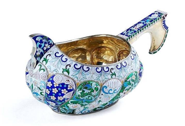 Description: 875er Silber, vergoldet. Umlaufend auf der schalenformigen, geschweift gebuckelten Wandung stilisiertes Bluten- und Blattwerk alternierend auf weibem, russischgrunem und kobaltblauem Grund in feinem, polychromen Cloisonne email. Die Querseiten mit kantigen Handhaben, die groЯe in Form eines "L", die kleine in Form eines Dreiecks mit geschweiften Seiten. Unterhalb des Lippenrandes Dekor aus stilisierten, hongenden Bluten und Kugelbandern auf weibem Fond. Die Handhaben dekoriert mit Blutenranken. An der Bodenunterseite gemarkt mit kreisformiger Marke "Frauenhaupt mit Kokoschnik nach rechts gerichtet", ovale Marke der Bezirksbeschauadministration Moskau mit Feingehalt "84" und Meisterzeichen "FR" in Kyrillisch. Der weibe Emailfond partiell mit minimalen Vergilbungen, unterhalb der kleinen Handhabe sowie an einer Langsseite der weibe Fond mit Restaurierung. Vgl.: Verzeichnis der russischen Gold- und Silbermarken. Nr. 1938, 1941.