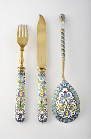 Important set of Feodor Ruckert, Carl Fabergй silver gilded cloisonnй enameled knifes, forks and spoons