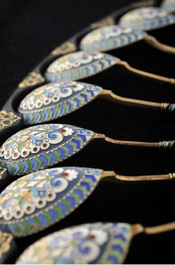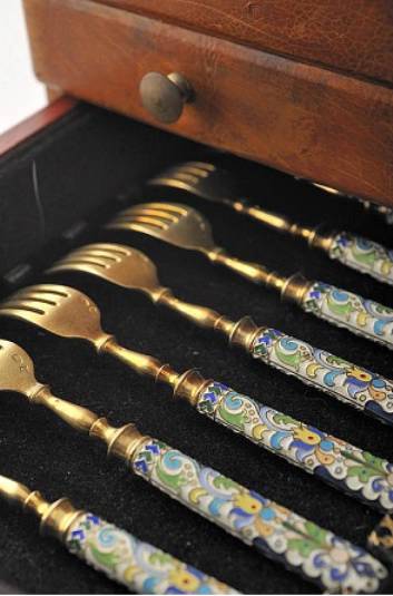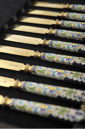 Lot 14 : Important set of Feodor Ruckert, Carl Faberge silver gilded cloisonnй enameled knifes, forks and spoons
