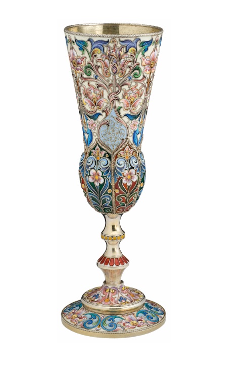 Silber 88 Solotnik, partiell vergoldet und emailliert. Auf getrepptem Rundfub, kurzer Balusterschaft, kelchfцrmige, am Ansatz gerippte Kuppa. Auf der Wandung umlaufend feiner Rocaille- und Blumendekor in Cloisonne-Technik. Feingehaltsstempel und Meistermarke «FR» in kyrillischen Buchstaben. H. 18,5 cm. 256 gr.