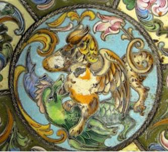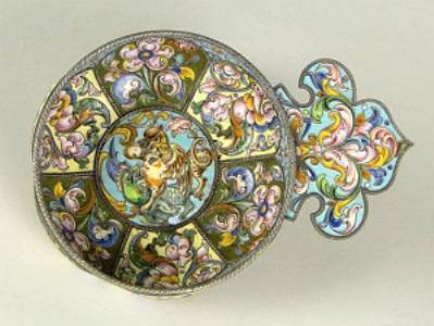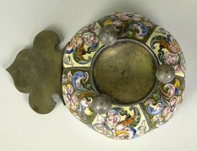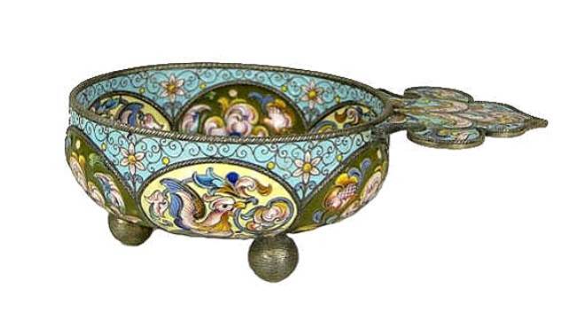 Description: 19th Century Russian Moscow Sterling Silver and Enamel Churka on Ball Feet. Circa 1880-1899. Signed Fedor Ruckert Hallmark and Moscow City Mark. Enamel Damage to Center or else Good Condition. Measures 2 Inches Tall and 6 Inches Long. Shipping $27.00