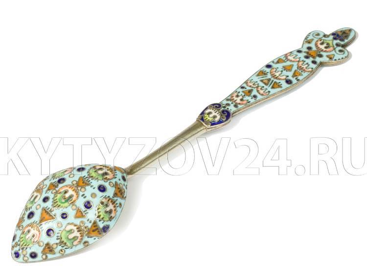 Однако, не только доброе имя мастера и благородный материал достойны внимания в этом изделии. Ложечка пышно роскошной эмалью. Подобный колорит характерен для произведений Федора Рюкерта – выдающегося мастера, сотрудничавшего с московским филиалом фирмы К. Фаберже. Его мастерская, находившаяся на Воронцовской улице в Москве, производила в основном небольшие серебряные изделия, украшенные эмалью по скани, в узорчатую ткань которых искусно включались живописные эмалевые миниатюры на темы из русской истории, боярского быта, фольклора. На произведениях Рюкерта, созданных им для фирмы Фаберже, его именник сочетается с клеймом знаменитой фирмы. Довольно часто именник Рюкерта «ФР» соседствует с инвентарным номером фирмы Фаберже.