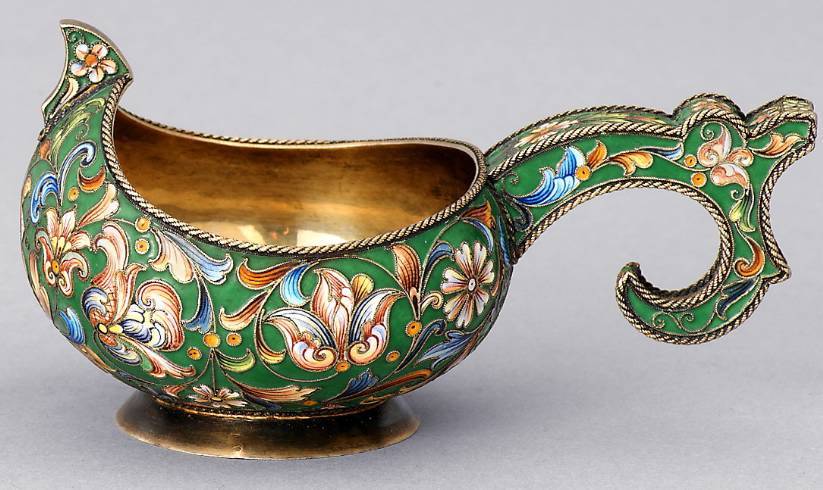 1199.Kovsch Firma Owtschinnikow, Moskva 1896-1908, 88 zolotnik, verkmästarstämpel Fedor Rückert samt svan i oval. Traditionell form, förgylld, dekor av blommor i polykrom skuggad emalj mot grön botten. L 11, vikt cirka 105 gram.