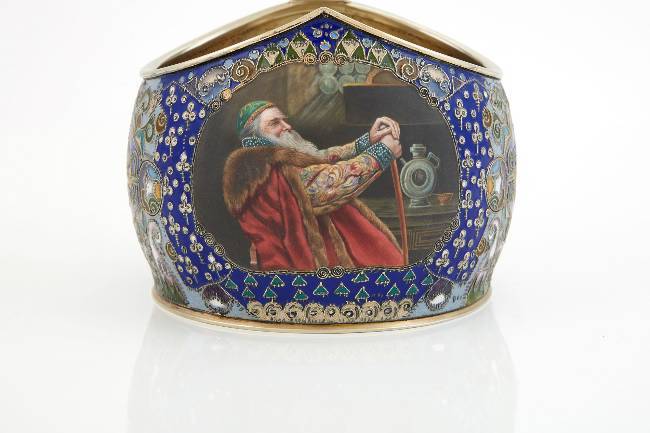 The works of the eminent Russian painter, Konstantin Makovsky (1839-1915), were a source for decoration by the most important craftsman producing enamel in Russia in the late nineteenth and early twentieth centuries. Makovsky was a master of history painting whose works evoked the romance of a lost age which appealed to Russian sensibilities of the time. Capitalizing on the popularity of the artist, Fabergé, Ovchinnikov, and others reproduced the artist's works on a range of objects, from kovshi to caskets. Feodor Rückert, arguably the most talented of all craftsmen producing enamel, whose objects were retailed by Fabergé and other prominent firms, also drew inspiration from Makovsky's paintings. A Boyar Wedding Feast is perhaps the most widely reproduced of Makovsky's works on objects from Rückert's workshop. Less common is the subject reproduced on the present kovsh, The Boyar, which is executed to the highest technical standard and which serves as an example of Rückert's production at its finest. Another example of a work by Fabergé in cloisonné and en plein enamel with a detail of The Boyar is a box in the collection of the Hillwood Museum in Washington, DC (catalog number 15.209).