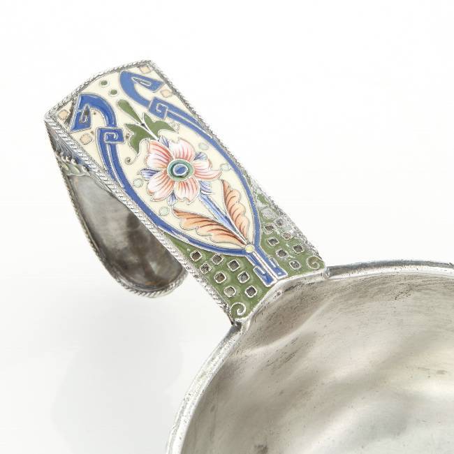 The kovsh with losses to enamel in areas (prow, flower on one side, handle); light surface scratches and bruises to edges; one side of foot slightly impacted; the cup in generally good condition.
