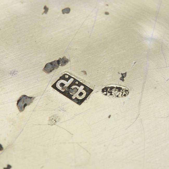 Of typical form, with raised prow and hook handle, the rounded body decorated with scrolling foliage, flowerheads and geometric motifs, set at intervals with green onyx cabochons. Length 7 1/2 inches (19 cm).
