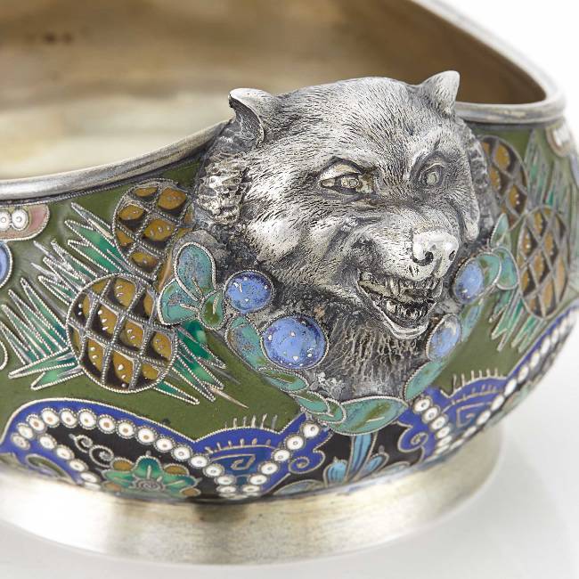 Oval with bombé sides, on a spreading foot, the sides with handles cast and chased as bear heads, the bowl enameled with shaded varicolored flowers, foliage and pine cones on red and green grounds, the interior engraved with a monogram, further scratched with an inventory number. Width across handles 5 3/4 inches (14.6 cm).