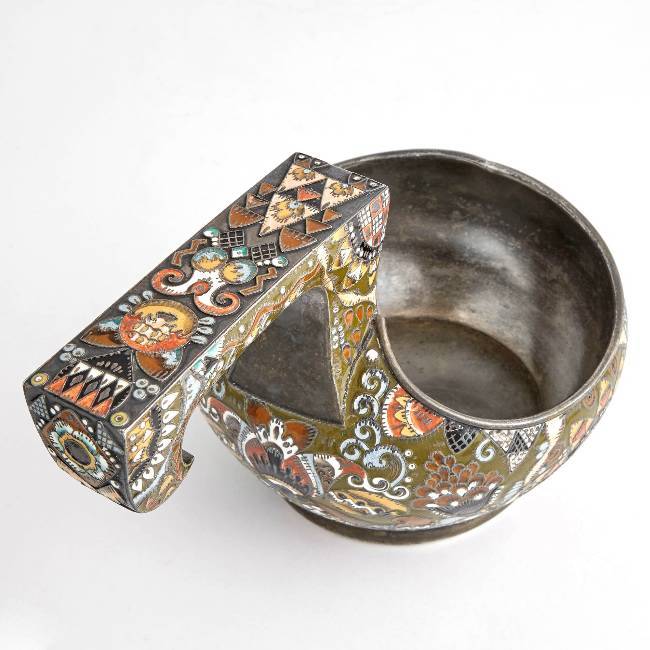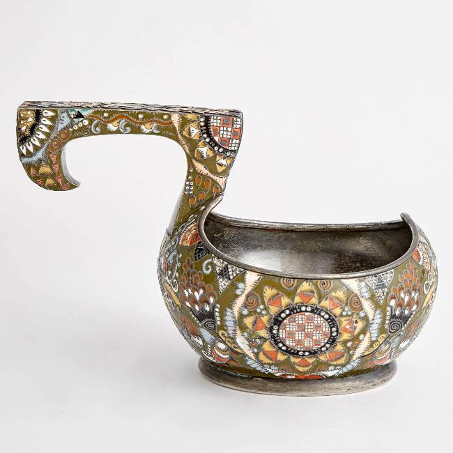 It was during this latter period that Rückert was at his most inventive and produced his finest works. Turning from realistic floral decoration in a jewel-tone palette, he embraced the use of abstracted floral and vegetal forms, geometric motifs and animal forms, using a palette that mixed earth tones with jewel tones. The forms of his objects, for example the handles of kovshi, became more exaggerated and experimental. Lot 11 in Doyle’s April 28 Russian Works of Art auction, a Silver-Gilt and Cloisonné Enamel Kovsh by Rückert and retailed by Fabergé, with its abstract floral ornament in earth tones and angular handle, is one such example. Lot 13, a Silver and Cloisonné Enamel Bowl by Rückert, was cast with handles in the form of bear’s heads that lend the object a folkloric quality.