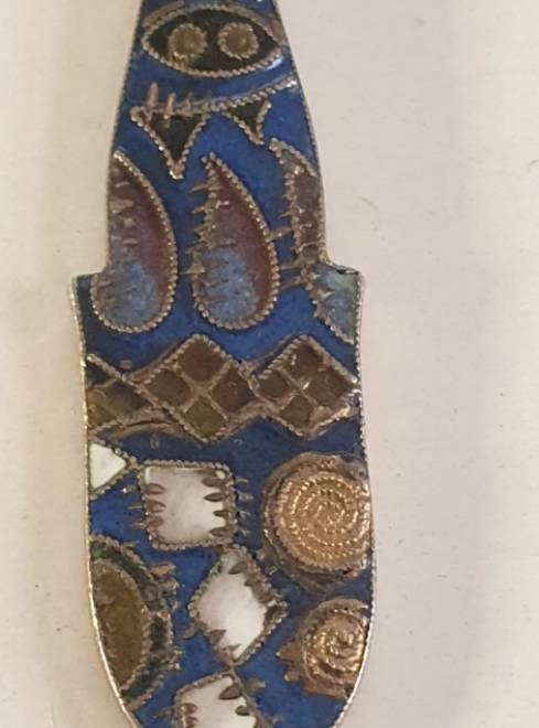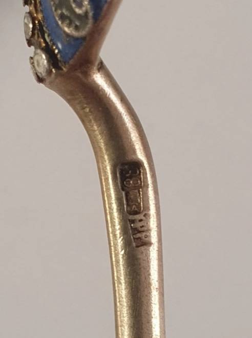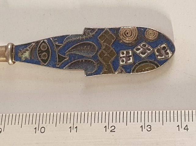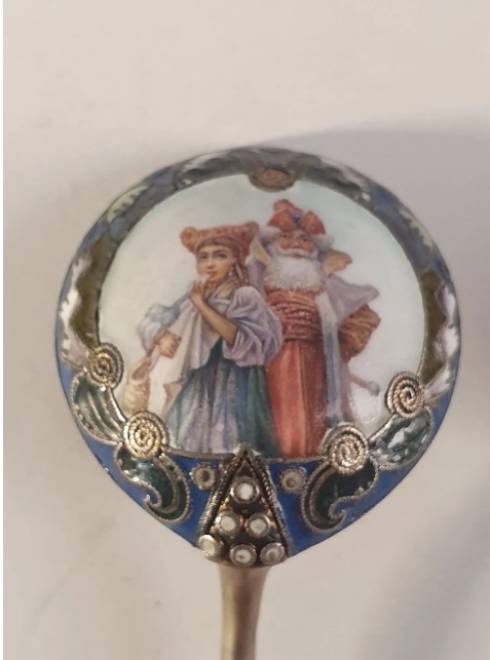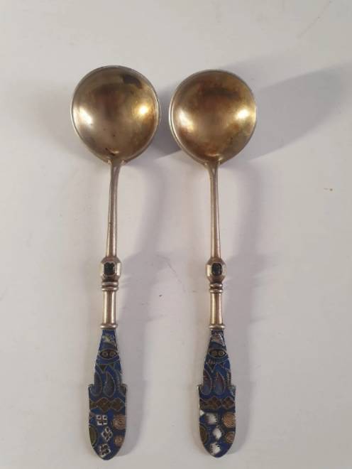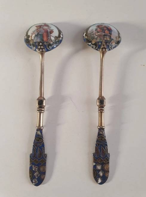 Exceptional pair of Imperial Russian enamelled silver spoons, silversmith Feodor Ruckert, Moscow,