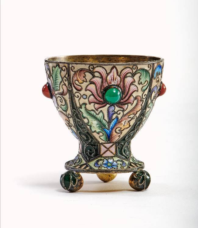 Серебряная стопка, украшенная полихромной эмалью по скани