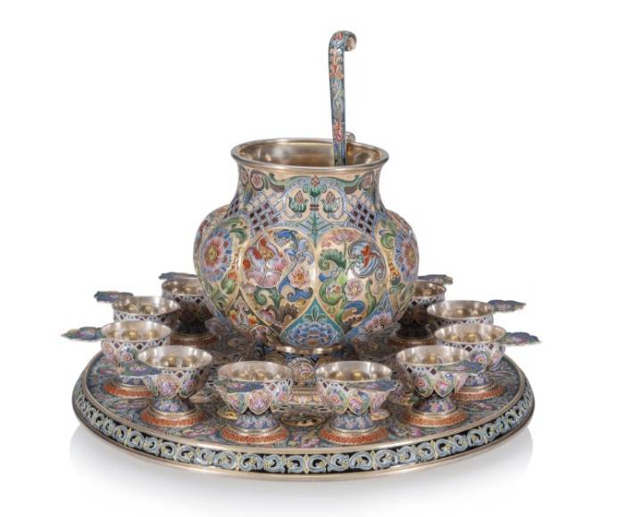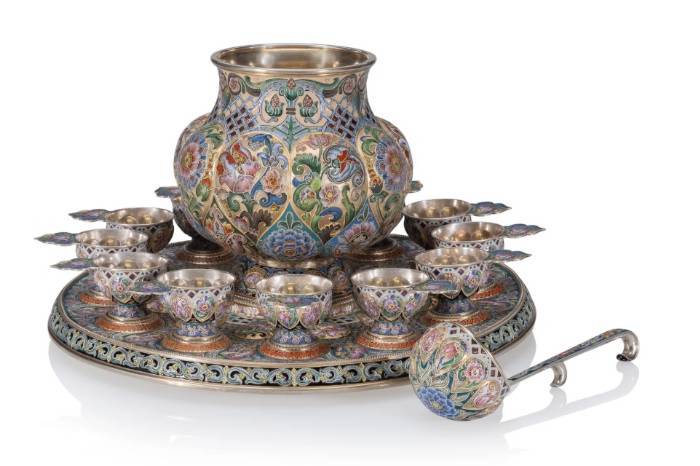 The offered lot is one of the most impressive punch sets in the Pan-Slavic style produced by the workrooms of master enameller Feodor Rückert for the House of Fabergé. Very few complete works of this scale survived the Revolution, and the exceptional and recently rediscovered journey of this work from the storerooms of the Fabergé firm to the home of a General Motors executive in New Jersey is a lesson in history, revolution, and social and economic change. Fabergé and Rückert
