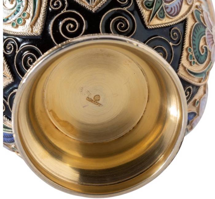 The Confiscation and Nationalization of the Fabergé Firm's Stock, 1919 On March 30, 1919, a Soviet commission from the Cheka arrived at the store's shuttered premises to carry out the nationalization of Fabergé's property. The removal of the valuables, which began with the impoundment of Fabergé's stock in September 1918, was technically illegal, as the company and its assets were formally owned by foreign stakeholders. However, internal violations within the Fabergé firm also played a role—two employees were caught attempting to sell 8 kg of gold in a sting operation orchestrated by the Cheka, and this was used as an excuse to take the valuables. At the time of this confiscation, an important inventory was drawn up, which listed all of the property remains in the firm's vaults, workrooms and storage areas, together with valuations. The offered lot is described as "Box No. 64" and clearly identified from its conforming inventory numbers: "23318 1 enamel Bratina; 23319 12 enamel charkas; 23320 1 enamel tray, 23321 1 enamel ladle" and with the ensuing weight of 17 funt' 16 lot (approximately 17 lbs 2.5 oz) and valued at 10,400 rubles.