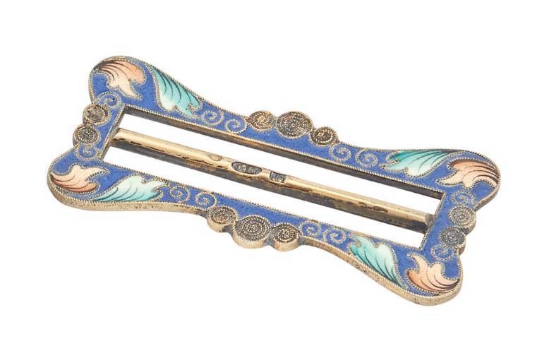 Comprising a heart-shaped box, Antip Kuzmichev, a belt buckle, Feodor Rückert, and a kovsh, Ivan Saltykov. Length of kovsh 3 3/4 inches.