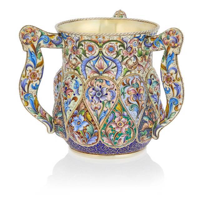 Russian Silver-Gilt and Cloisonné Enamel Three-Handled Cup