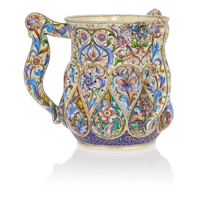 A comparable but smaller enamel three-handled cup by Feodor Rückert was sold in these rooms May 23, 2024, lot 696 (https://bit.ly/3XEPUHA).