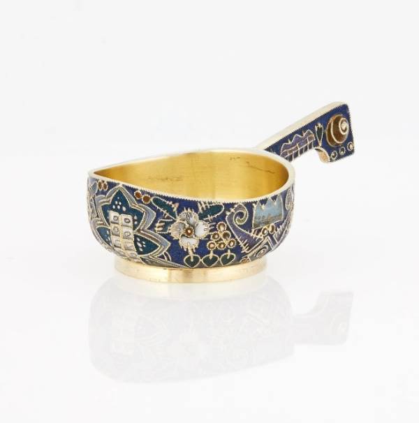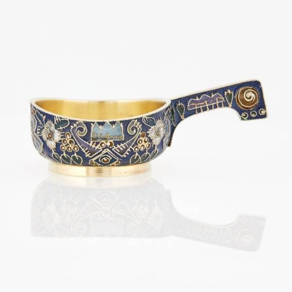 Circular, with an angular handle, enameled with varicolored shaded stylized flowers, foliage and geometric motifs on a dark blue ground, with a later French import mark.