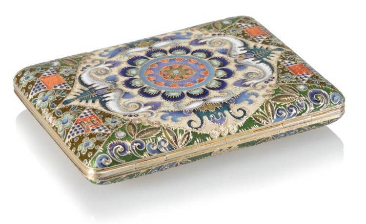 This beautiful case in the pan-Slavic style is undoubtably by the hand of Feodor Rückert, the marks likely overstruck with those of the famed Moscow firm of Khlebnikov, who commissioned and retailed from and by Rückert for many years. For other works by Rückert retailed by Khlebnikov, see also a covered cup sold in these rooms December 16, 2024, lot 82071.