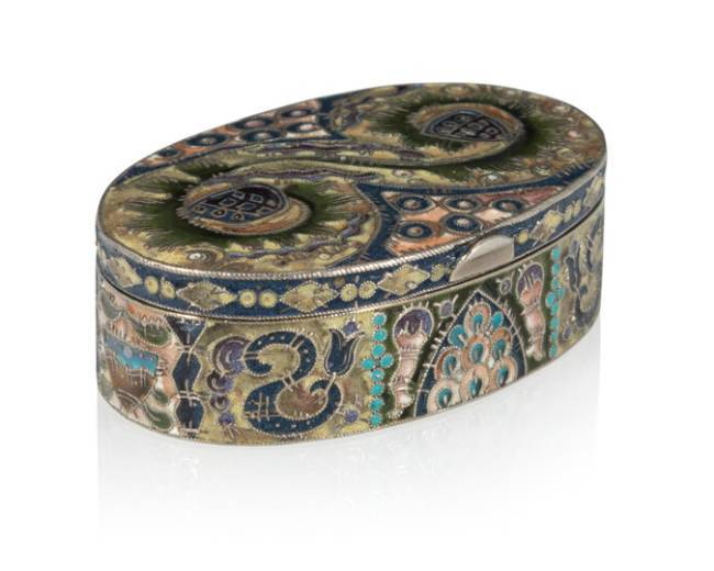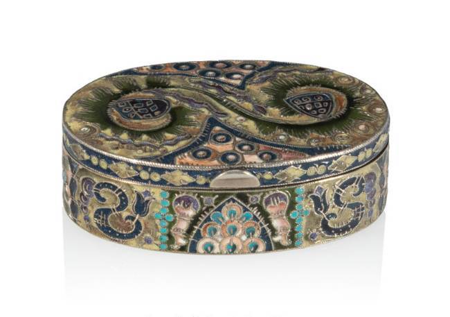 A Fabergé Gilt Silver Cloisonné Enameled Oval Box in the Pan-Slavic Taste