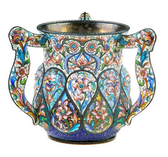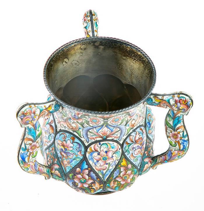 Размер и материал: Серебро, эмаль по скани, золочение; В. – 12,4 см; Ш. с ручками – 15,5 см; Вес – 653 г