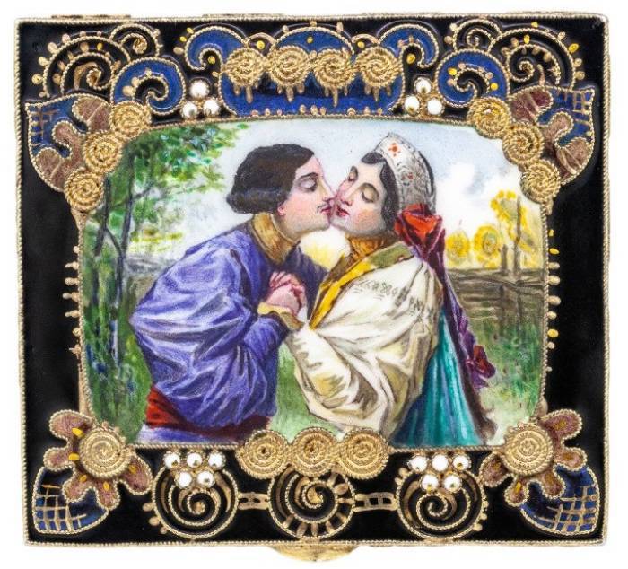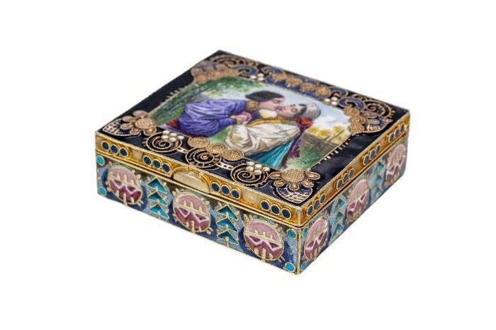 Главным украшением коробочки является виртуозно выполненное живописное эмалевое панно с матовой поверхностью («en plein»).