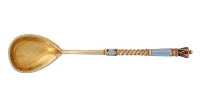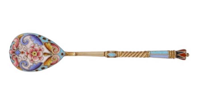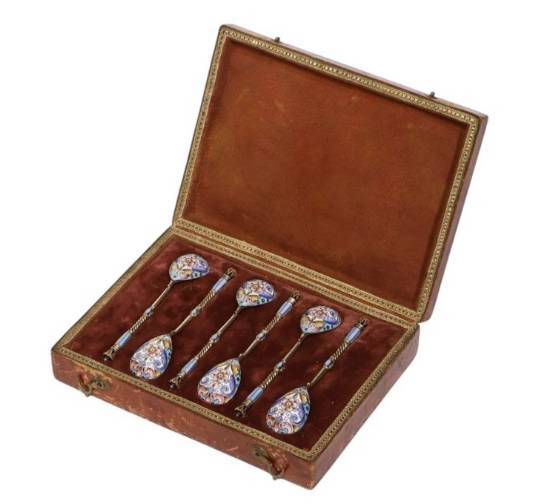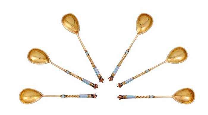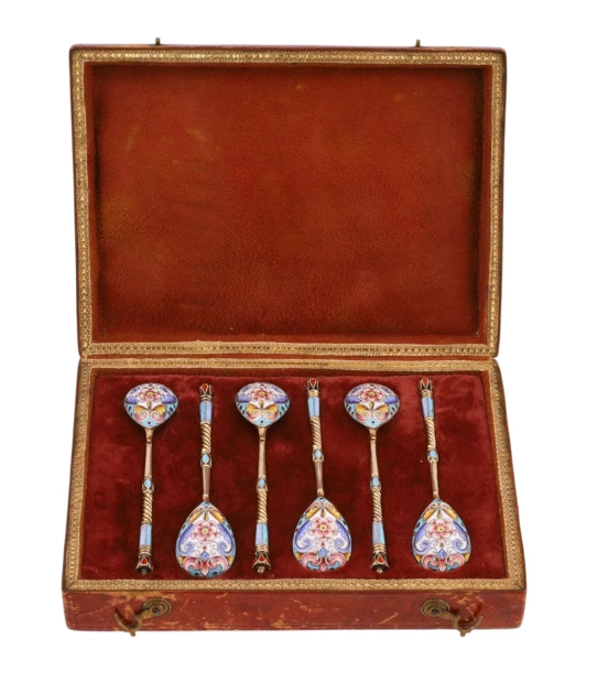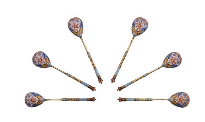SET OF SIX RUSSIAN SILVER-GILT AND CLOISONNÉ ENAMEL TEASPOONS.
