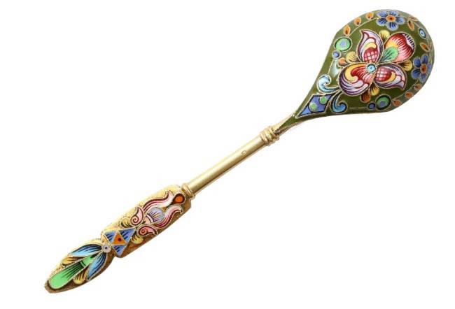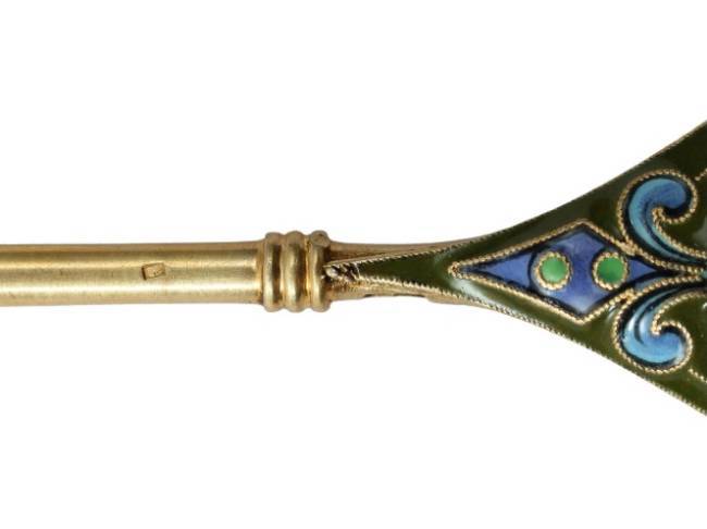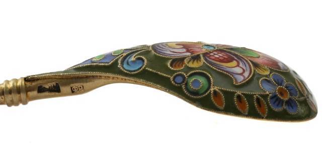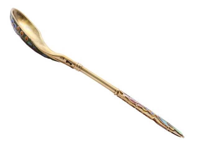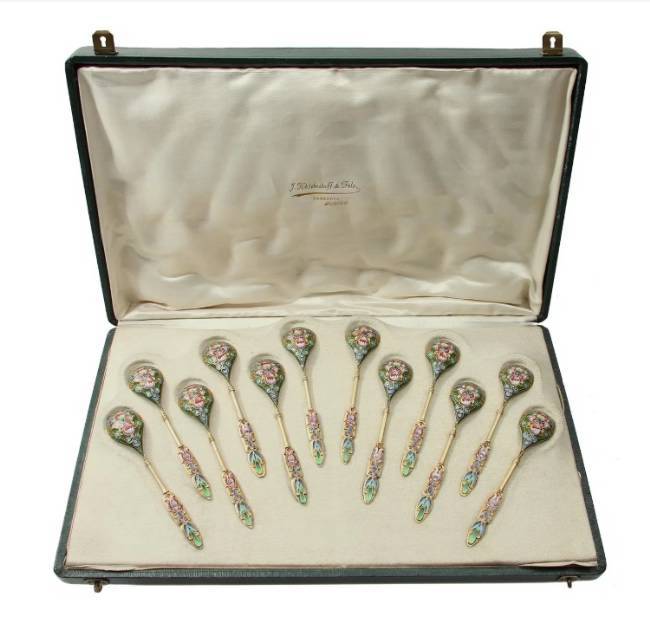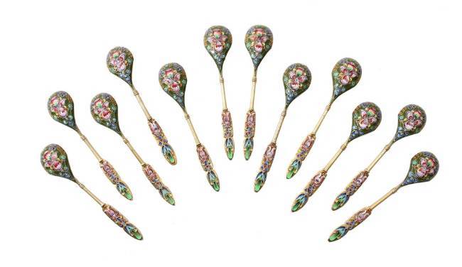 A set of 12 Feodor Ruckert gilt-enamel spoons with cloisonne enamel in Pavel Ovchinnikov original case.