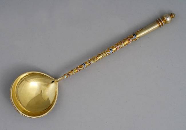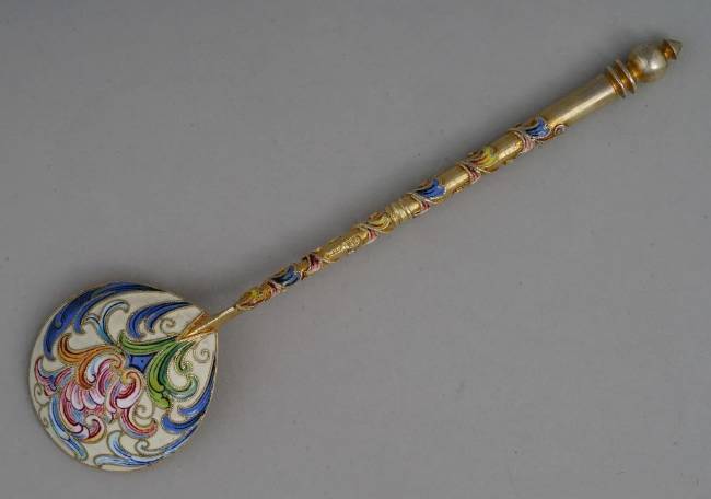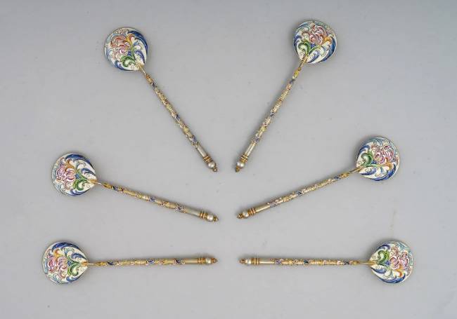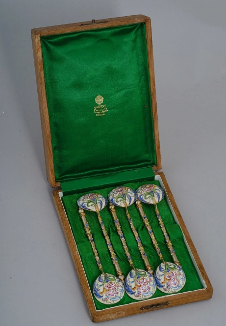 The spoons were designed by Feodor Ruckert for the House of Faberge. The spoons are marked in Cyrillic "F.R". The set comes with a wooden case lined with green satin inscribed "Faberge, Saint-Petersburg, Moscow, Odessa, London".