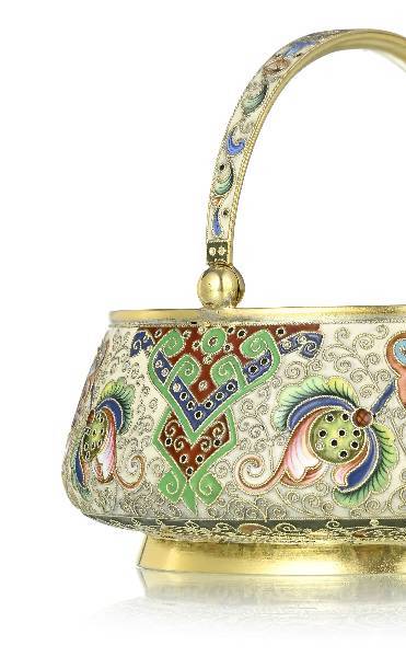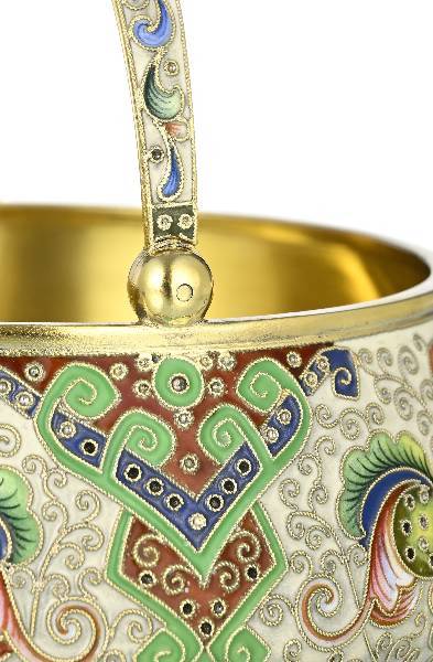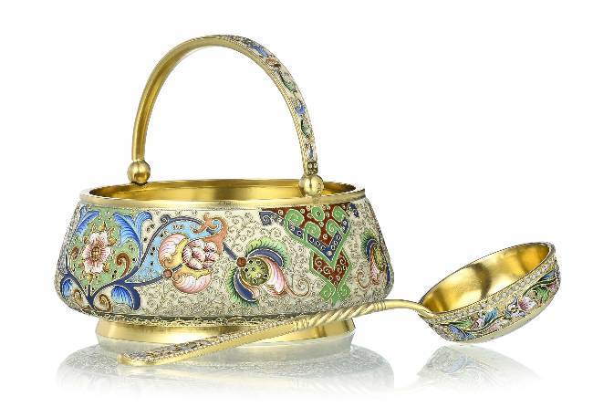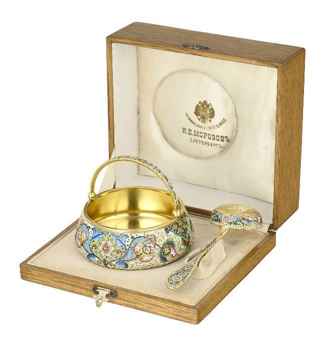 Panier à sucre et passoire en vermeil et émail cloisonné, orfèvres Féodor Ruckert et Maria Semenova,