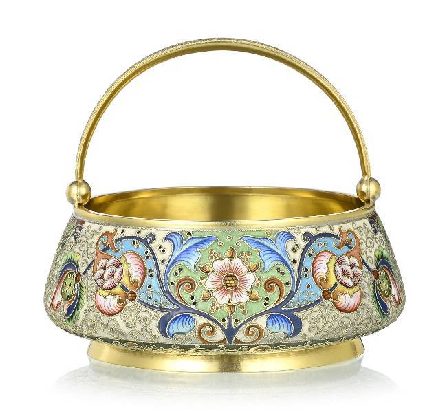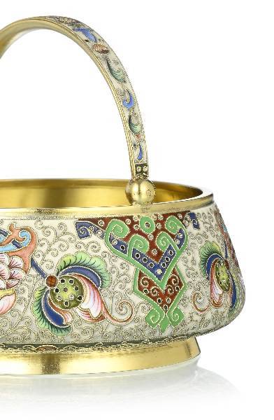 Le panier est poinçonné FR en cyrillique sous la base avec un kokoshnik 84, Ivan Lebedkin, Moscou. Nous n'avons pas trouvé d'autres poinçons