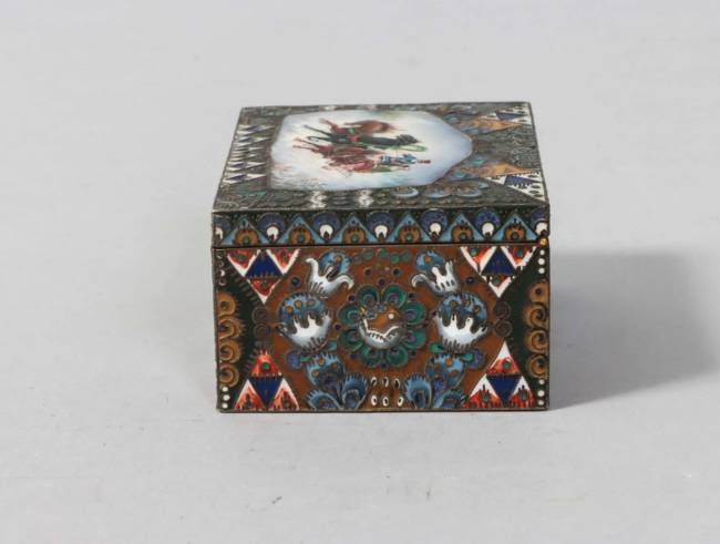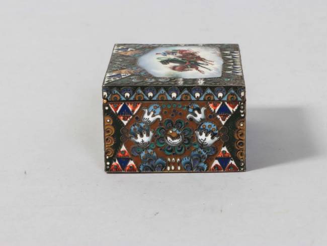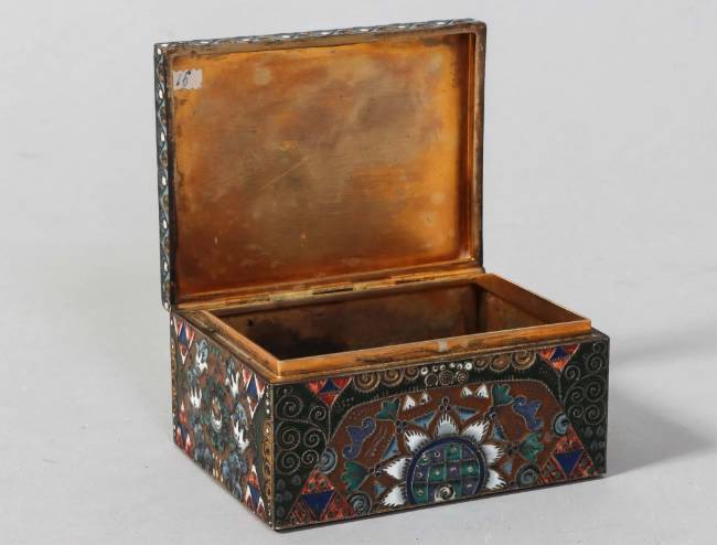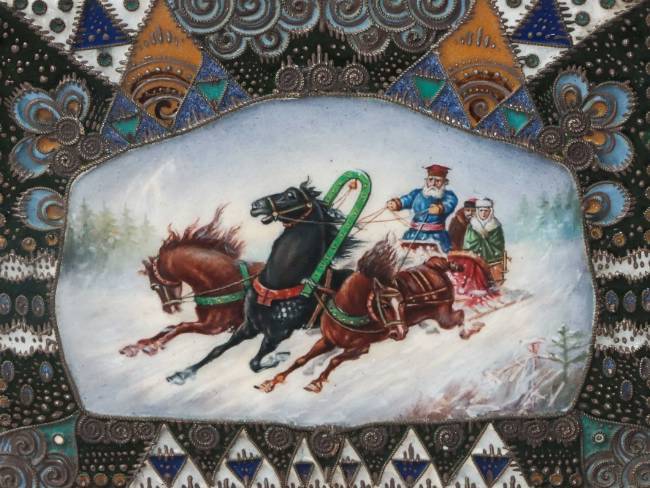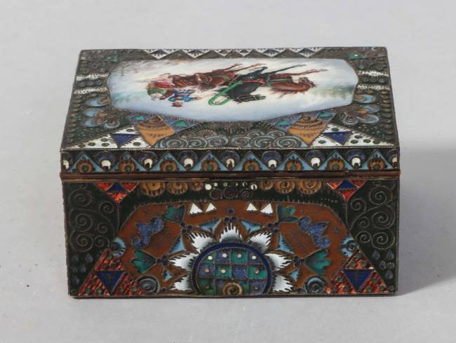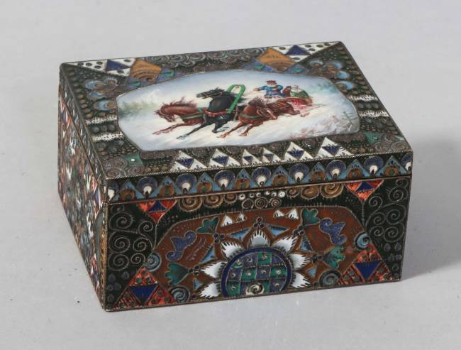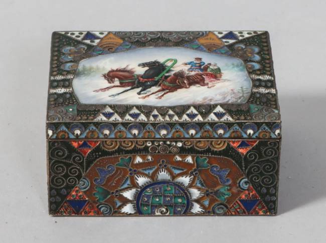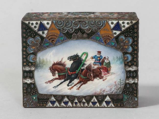 RUSSIE - Moscou - 1908-1917 Rare coffret rectangulaire en vermeil 88 zolotniks (916 millièmes) à décor émaillé polychrome cloisonné de motifs géométriques et végétaux symétriques de style Art Nouveau, le couvercle monté à charnière est orné au centre d’une scène émaillée en plein peinte d’une troïka dans la neige, avec un cocher et deux passagers Orfèvre : Feodor RÜCKERT pour Orest KURLIUKOV Poids brut : 252 g - Haut. : 4 cm - Long. : 8,5 cm - Prof. : 6,5 cm
