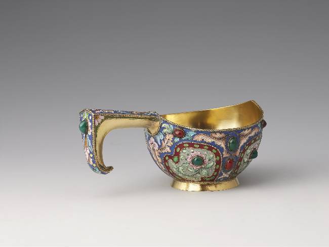 Deep, rounded vessel with handle to one side on a smooth, tapering basal ring. The outer surface richly decorated with polychrome cloissoné enamel surrounding seven bezel-set chrysoprase and six carnelion cabochons. The angular handle with corresponding decor set with a further chrysoprase at the terminal. Gilt interior. H 6.5; W 16; D 10 cm, weight 215 g.