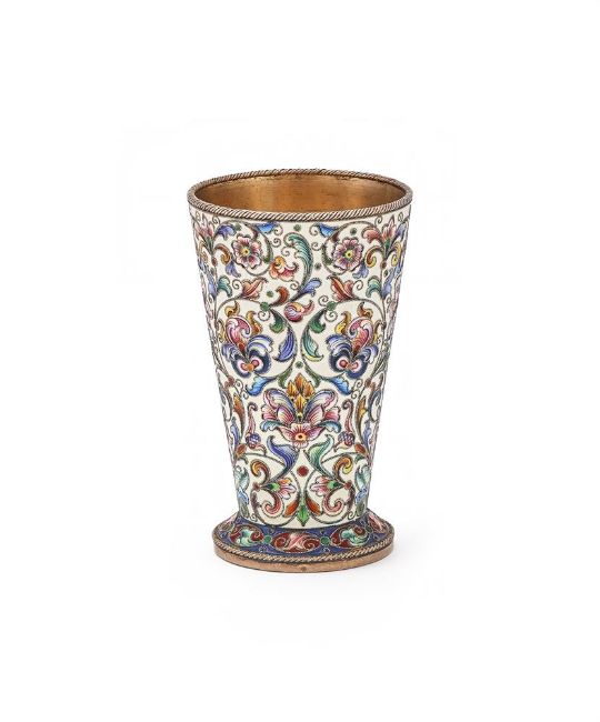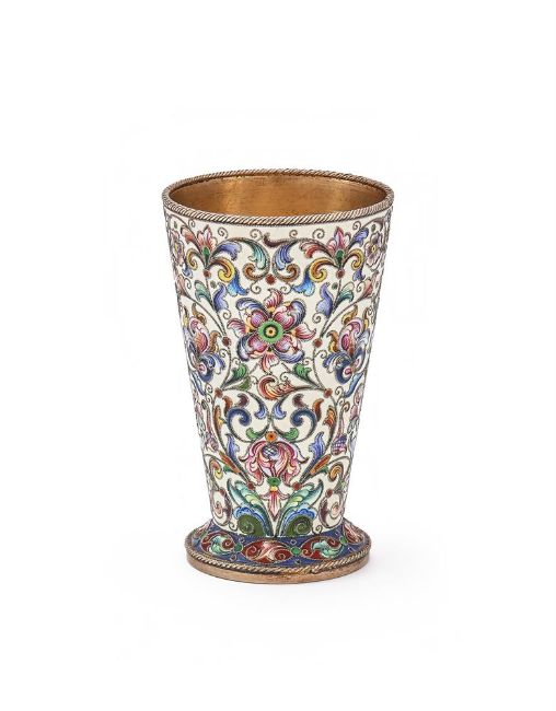 FEODOR RÜCKERT, A SILVER GILT AND CLOISONNÉ ENAMEL BEAKER WORKMASTER FEODOR RÜCKERT, MOSCOW, 1899-1903 Enamelled with colourful floral and foliate motifs on a cream ground, 88 standard, struck with initials FR in Cyrillic, assaymaster Ivan Lebedkin, later French import mark Size/dimensions: 10.4cm high Gross weight: 209.6 gramsProvenance: Private Collection Sale, Sotheby's New York, 'Russian Art' 16 April 2007, Lot 17 Condition Report: Some scratches and staining to inside. Some tarnish to recessed areas. Minor pitting to enamel and light wear. Good clear marks. Condition Report Disclaimer