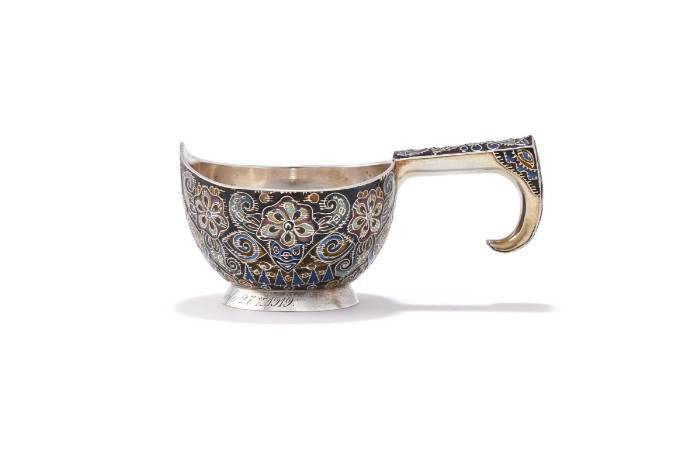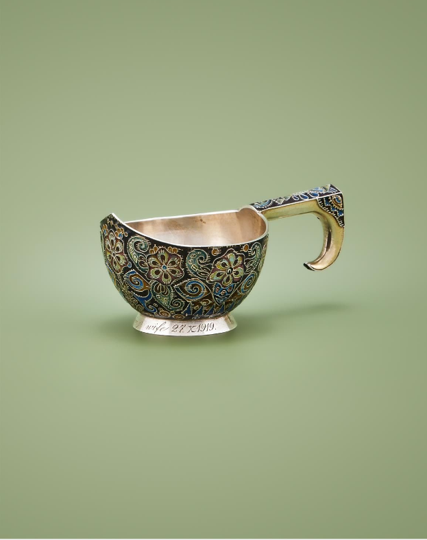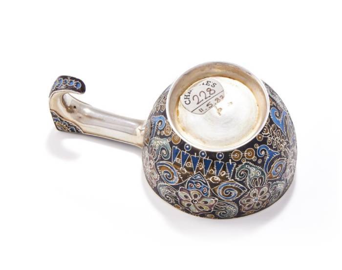 Emailled with blues, greens, mauve and grey on a brown ground, with an angled handle. the foot engraved 'From your loving wife 27.X.1919', Imperial Warrant mark oversriving with Feodor Ruckert's mark, 88 standard11cm de long109g.3.53 oz)Provenance:Une collection privée d'émaux cloisonnés russes.Le pied est gravé 'From loving wife 27.X.1919', Fabergé Imperial Warrant mark overstriking Feodor Ruckert's mark, 88 standard11cm long109g (3.53 oz)Provenance:A Private Collection of Russian Cloisonné EnamelsSale, Christie's Geneva, Important Objects by Carl Fabergé Russian Works of Art, 11th May 1982, Lot 228