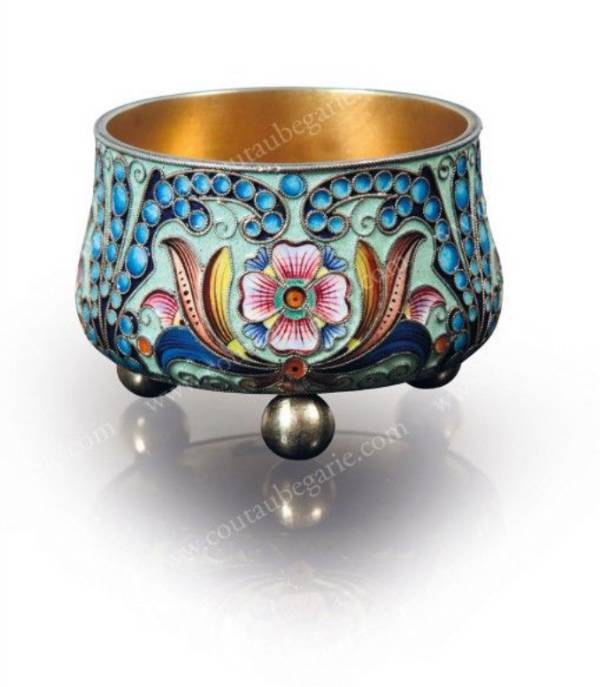 A décor de fleurs et d'arabesques en émaux polychromes cloisonnés sur fond émaillé vert pâle, reposant sur trois pieds boule, intérieur vermeil. Bon état.