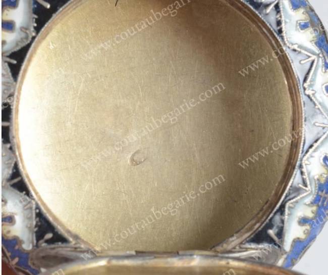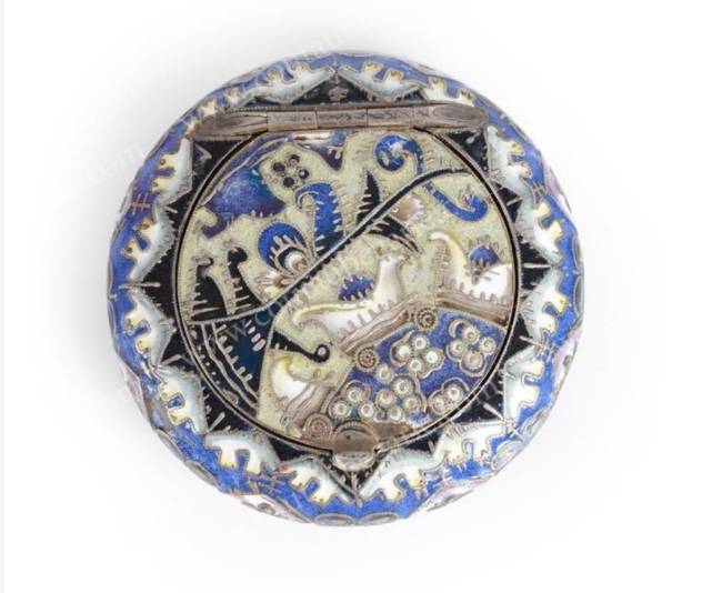 A décor d'émaux polychromes cloisonnés d'inspiration Art Nouveau, intérieur vermeil. Petits accidents. Poinçon titre: 84, Moscou, 1908-1917. Poinçon d'orfèvre: sans poinçons apparents, mais travail possible de Féodor Ruckert (1840 - 1917). H.: 1, 5 cm - Diam.: 5, 5 cm. Poids brut: 58 grs.