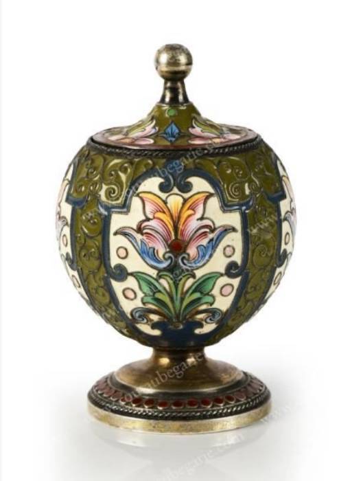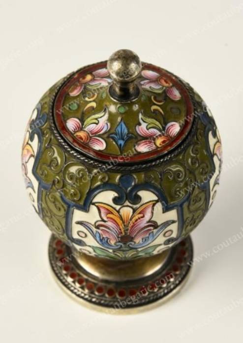 De forme bombée reposant sur une base circulaire, à décor de fleurs en émaux polychromes cloisonnés, sur fond émaillé ivoire, alterné de frises stylisées sur fond vert foncé, de style Art Nouveau. Bon état général. Poinçon titre: 84, Moscou, 1899-1908. Poinçon d'orfèvre: Féodor Ruckert. H.: 7, 5 cm - Diam.: 5, 5 cm. Poids brut: 81 grs.